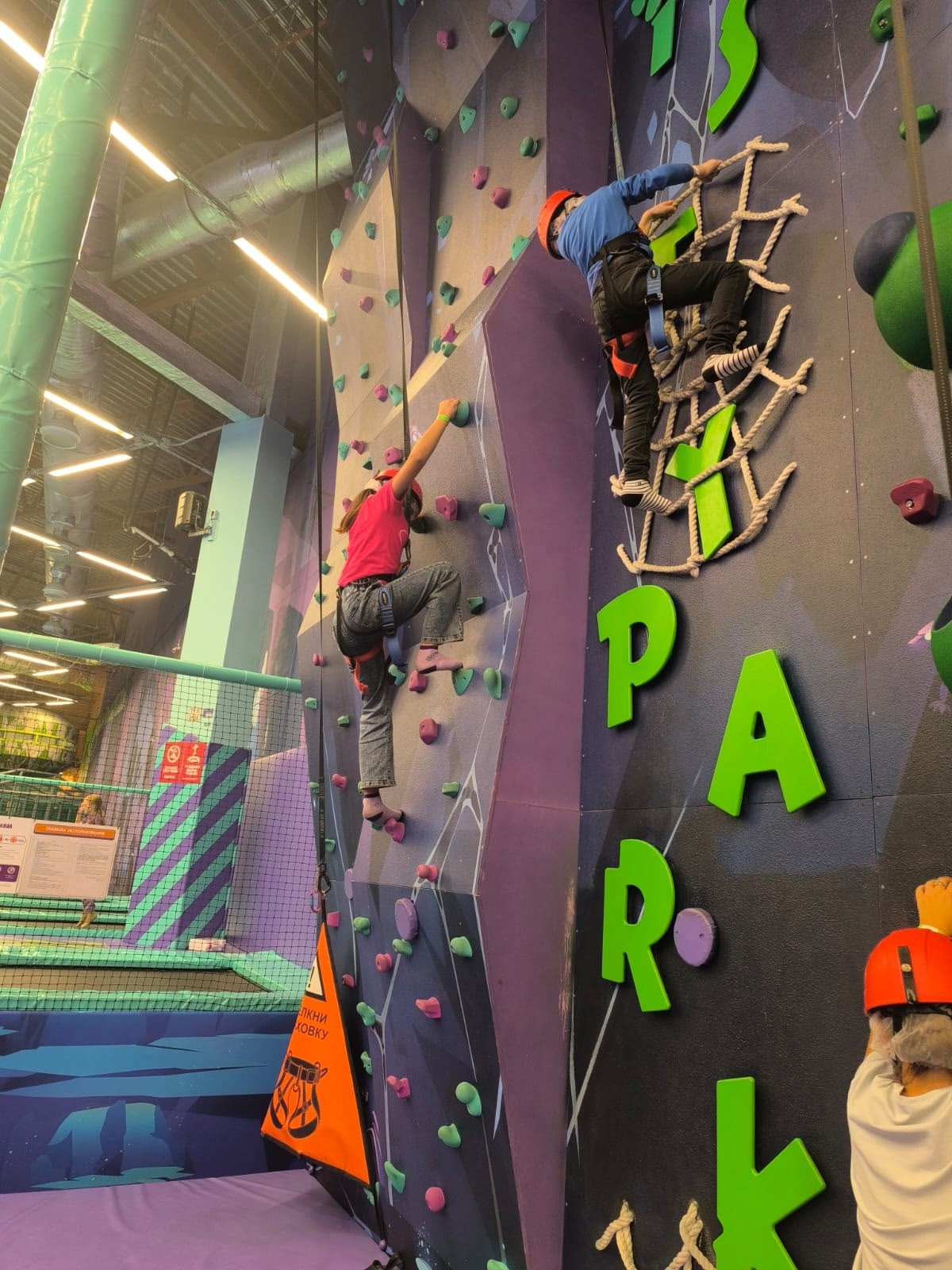 Также дети с удовольствием лазили по скалодромам в специальной экипировке, катались на огромных горках, прыгали на батутах, играли в больших сухих бассейнах с шариками.