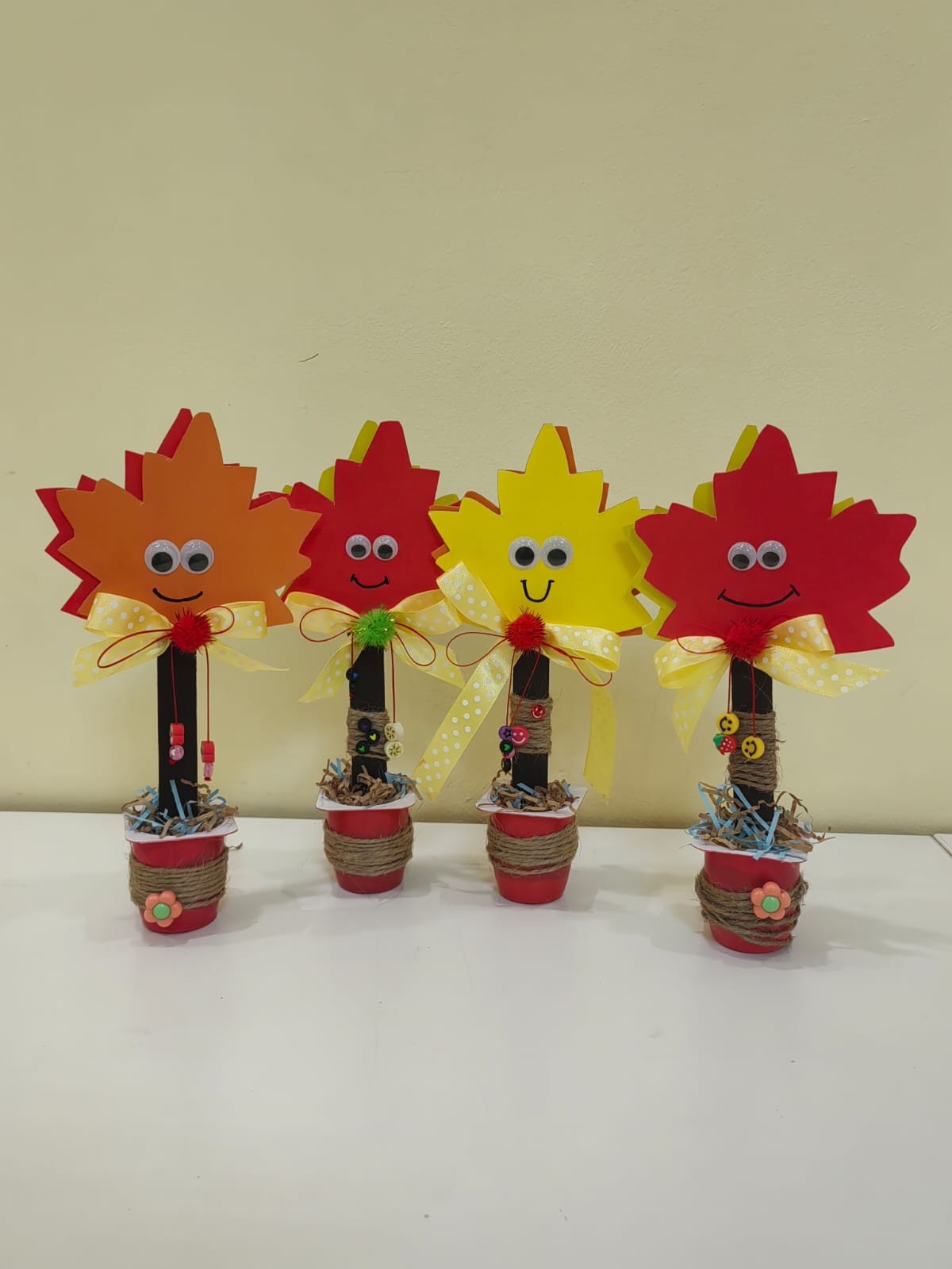 Под руководством педагога дети вырезали из цветного картона резные листики, придумывали им лица и подбирали украшения. Каждый кленовый лист нашёл себе место в красивом горшочке. Все осенние композиции получились веселыми и нарядными!