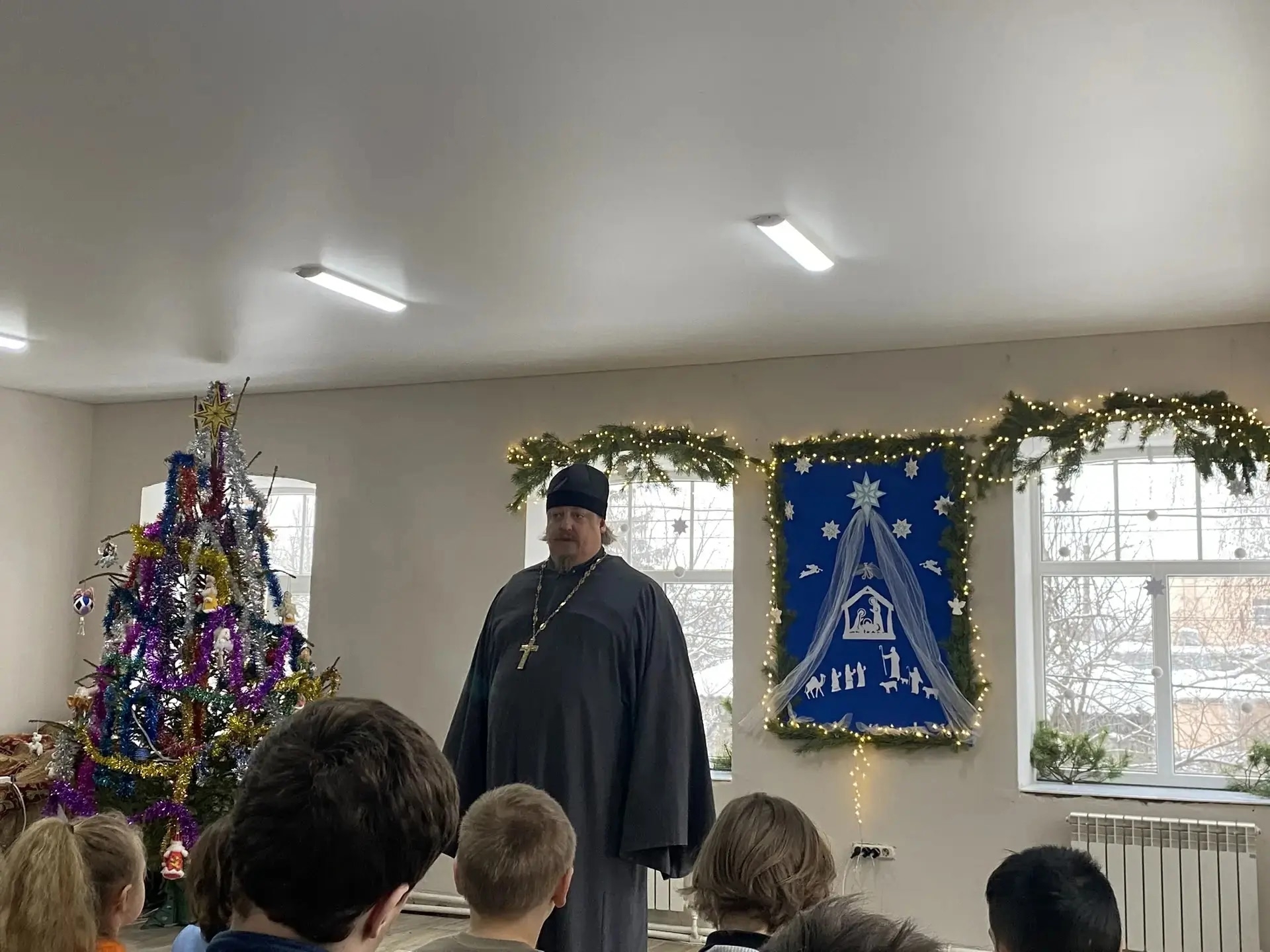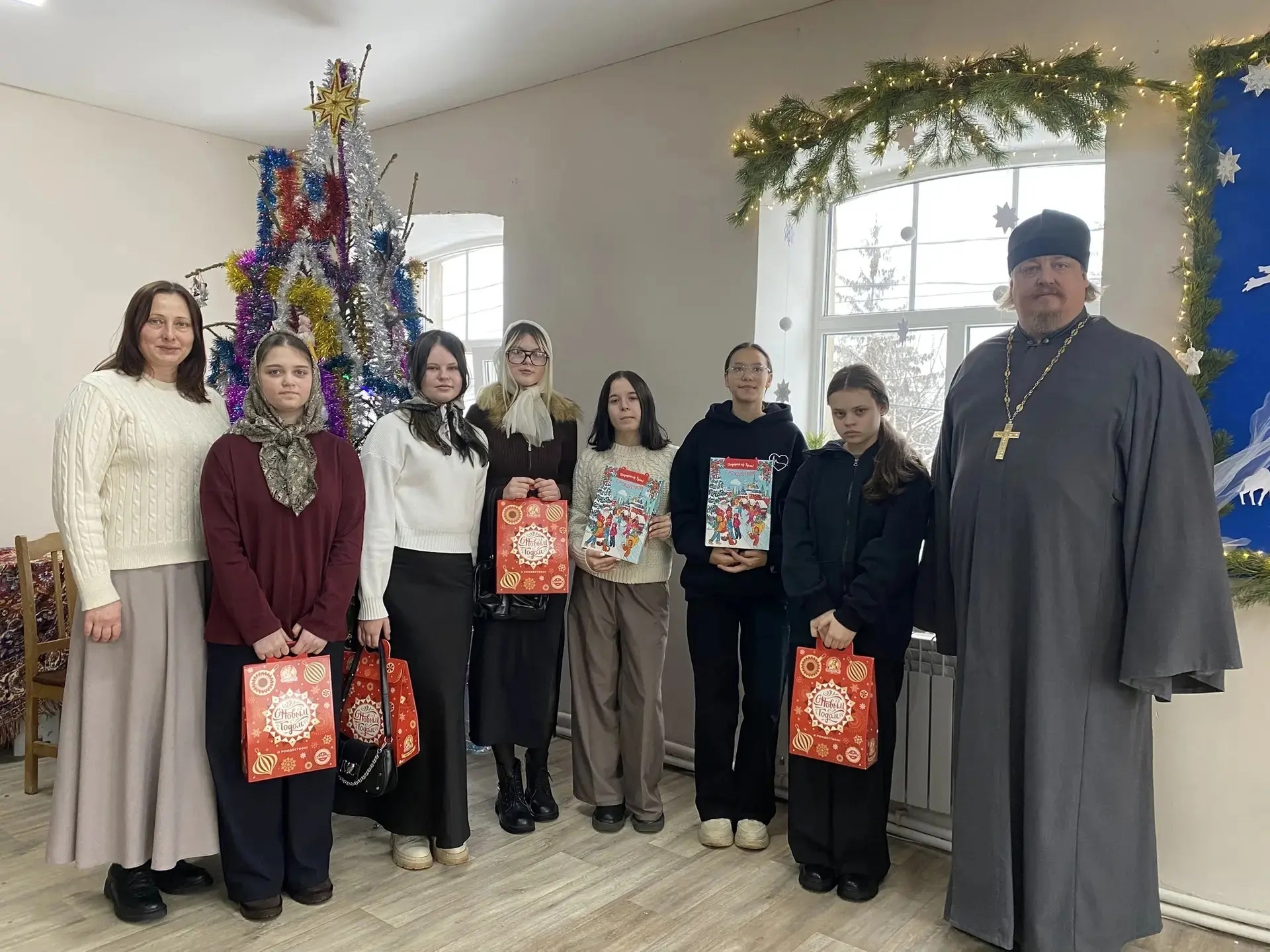 Ребята посмотрели выступление детского фольклорного ансамбля «Исток». Очень душевная постановка понравилась зрителям. Также девочки пообщались с отцом Александром. Он поздравил всех с Новым годом и Рождеством. Воспитанницам вручили сладкие подарки.